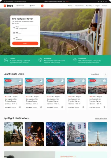 Togo is a professional WordPress theme that makes it easy to build a modern, beautiful tour booking website with full features for reservations, payments, and tour management.